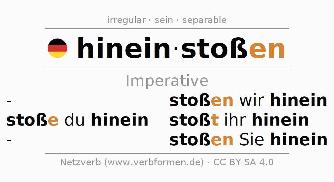The verb hineinstoßen (ist) fully conjugated in all persons and numbers in the Imperative Present