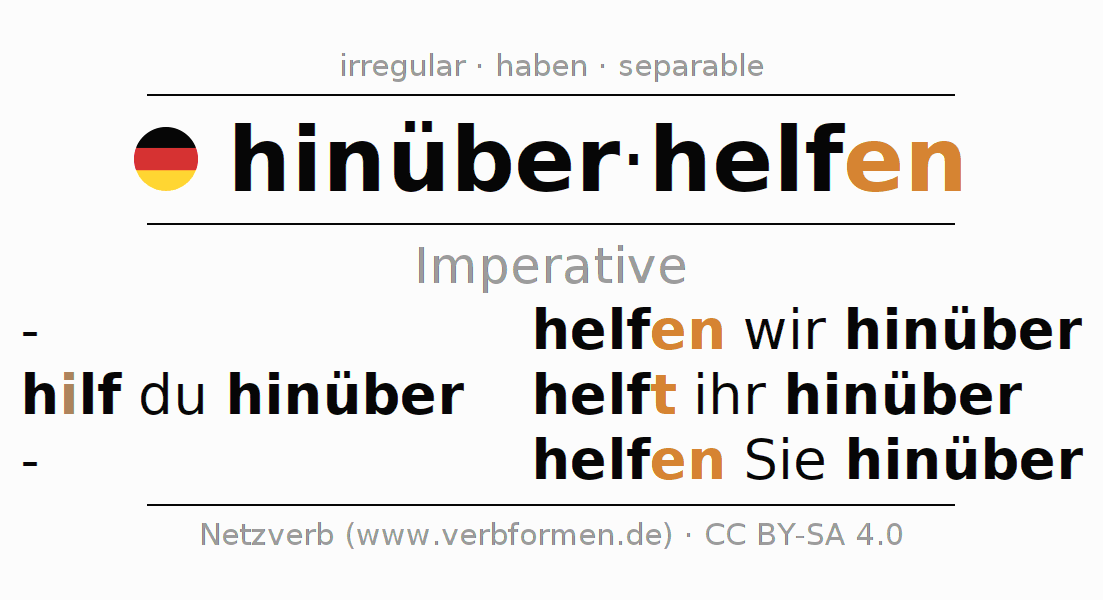 The verb hinüberhelfen fully conjugated in all persons and numbers in the Imperative Present