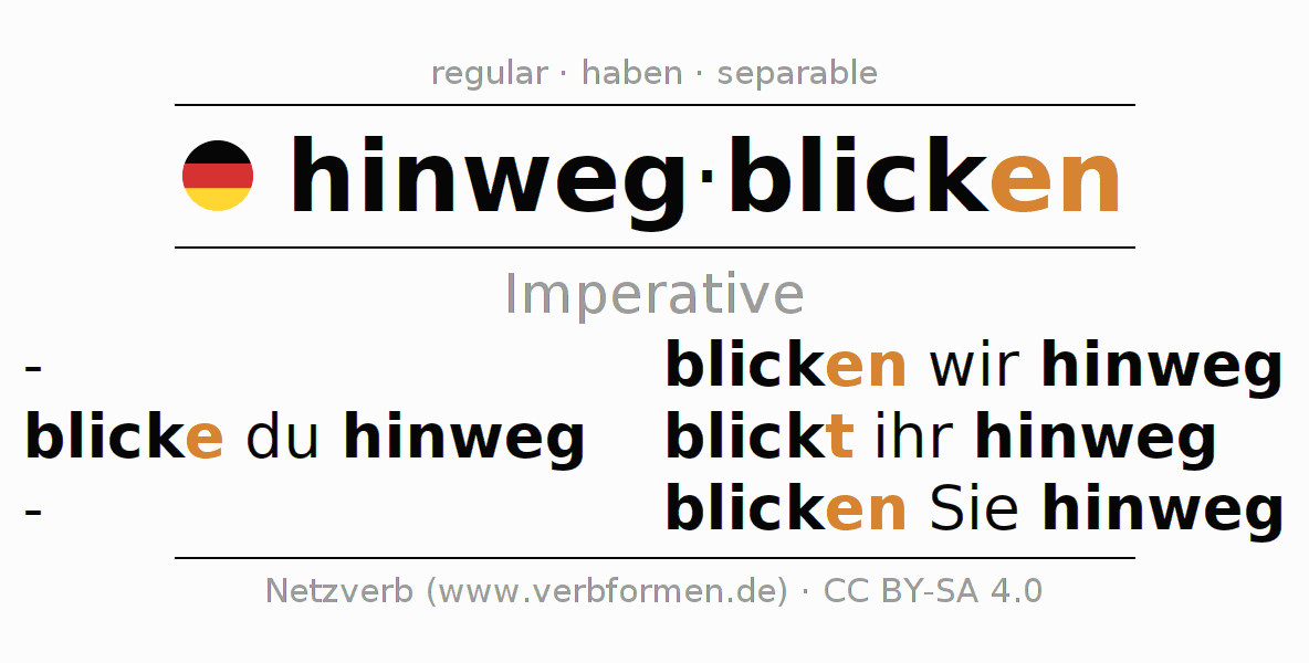 The conjugation of hinwegblicken in Imperative Present Imperative Active is blicke (du) hinweg, blicken wir hinweg, blickt (ihr) hinweg, blicken Sie hinweg.The conjugation corresponds to certain grammatical rules. Likewise the requirements for the conjugation of the simple verb forms of hinwegblicken in Imperative. Comments ☆