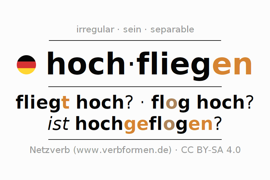 The conjugation of hochfliegen in Imperative Present Imperative Active is fliege (du) hoch, fliegen wir hoch, fliegt (ihr) hoch, fliegen Sie hoch.The conjugation corresponds to certain grammatical rules. Likewise the requirements for the conjugation of the simple verb forms of hochfliegen in Imperative. Comments ☆