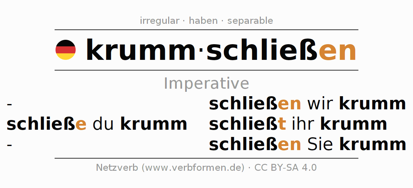 The conjugation of krummschließen in Imperative Present Imperative Active is schließe (du) krumm, schließen wir krumm, schließt (ihr) krumm, schließen Sie krumm.The conjugation corresponds to certain grammatical rules. Likewise the requirements for the conjugation of the simple verb forms of krummschließen in Imperative. Comments ☆