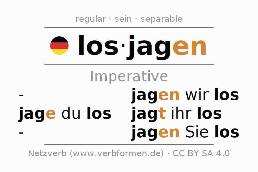The conjugation of losjagen in Imperative Present Imperative Active is jage (du) los, jagen wir los, jagt (ihr) los, jagen Sie los.The conjugation corresponds to certain grammatical rules. Likewise the requirements for the conjugation of the simple verb forms of losjagen in Imperative. Comments ☆