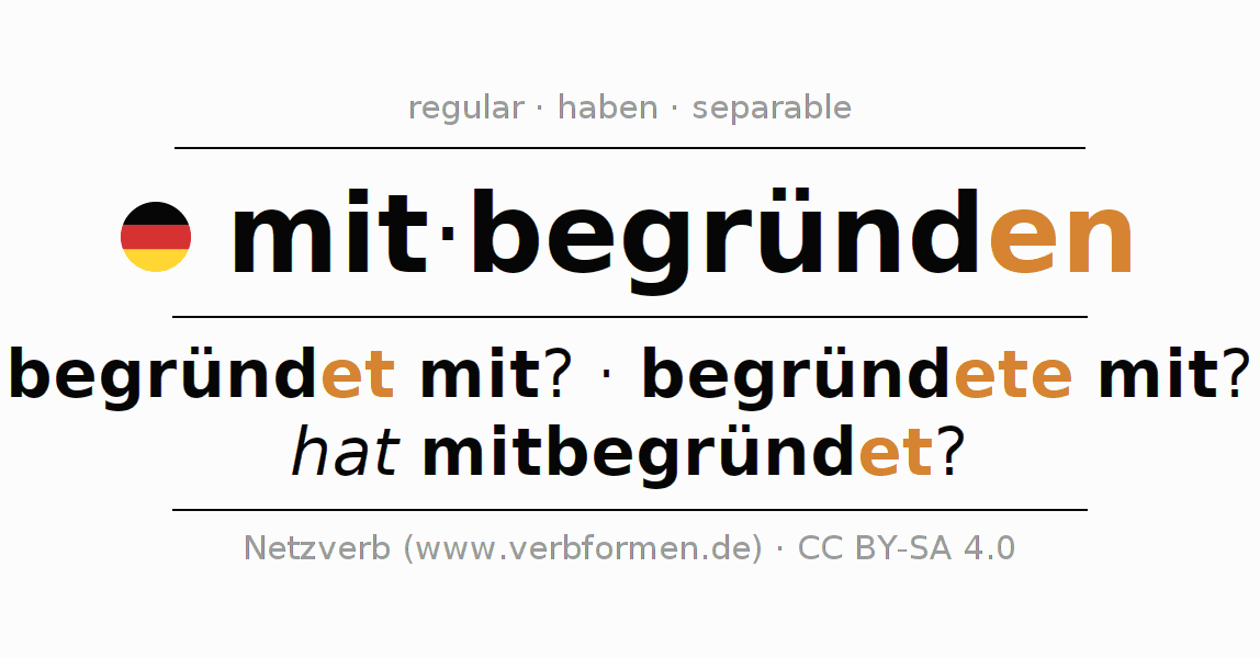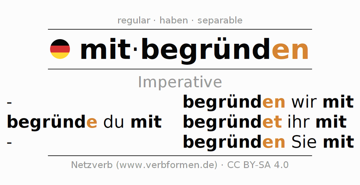 The conjugation of mitbegründen in Imperative Present Imperative Active is begründe (du) mit, begründen wir mit, begründet (ihr) mit, begründen Sie mit.The conjugation corresponds to certain grammatical rules. Likewise the requirements for the conjugation of the simple verb forms of mitbegründen in Imperative. Comments ☆