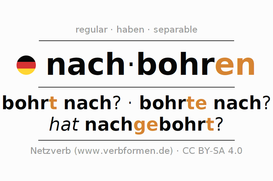 The conjugation of nachbohren in Imperative Present Imperative Active is bohre (du) nach, bohren wir nach, bohrt (ihr) nach, bohren Sie nach.The conjugation corresponds to certain grammatical rules. Likewise the requirements for the conjugation of the simple verb forms of nachbohren in Imperative. Comments ☆