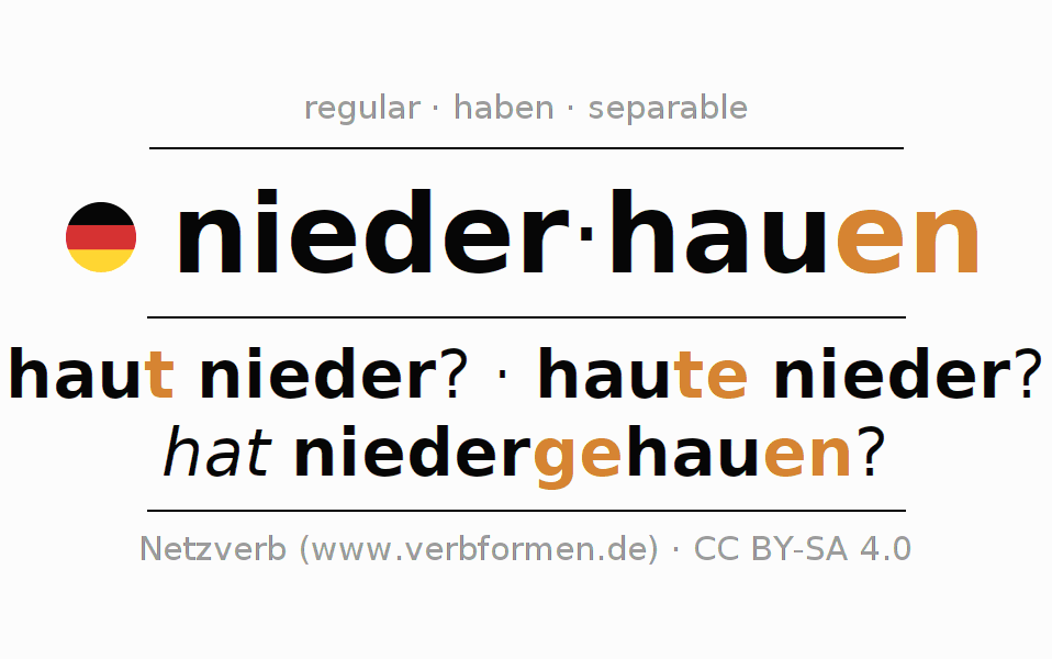 The conjugation of niederhauen in Imperative Present Imperative Active is haue (du) nieder, hauen wir nieder, haut (ihr) nieder, hauen Sie nieder.The conjugation corresponds to certain grammatical rules. Likewise the requirements for the conjugation of the simple verb forms of niederhauen in Imperative. Comments ☆