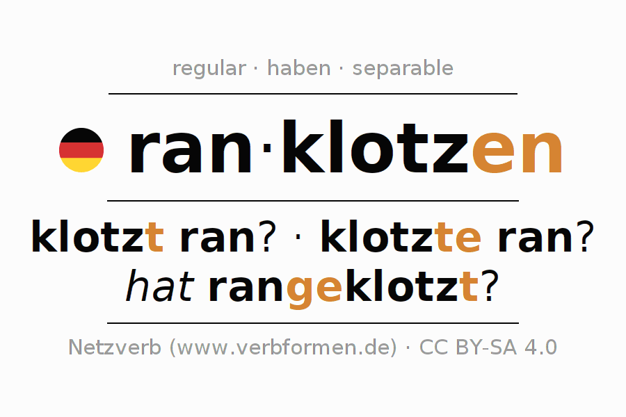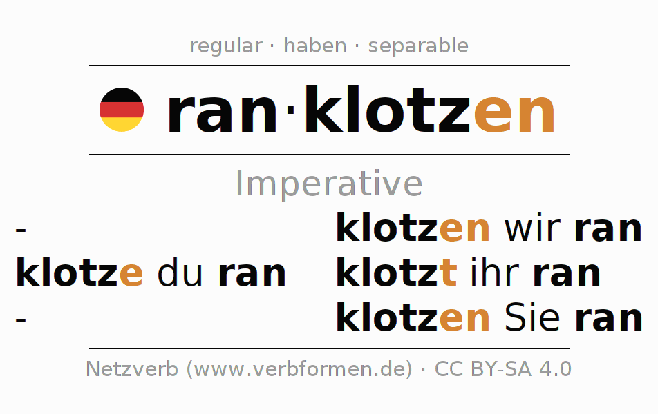 The conjugation of ranklotzen in Imperative Present Imperative Active is klotze (du) ran, klotzen wir ran, klotzt (ihr) ran, klotzen Sie ran.The conjugation corresponds to certain grammatical rules. Likewise the requirements for the conjugation of the simple verb forms of ranklotzen in Imperative. Comments ☆