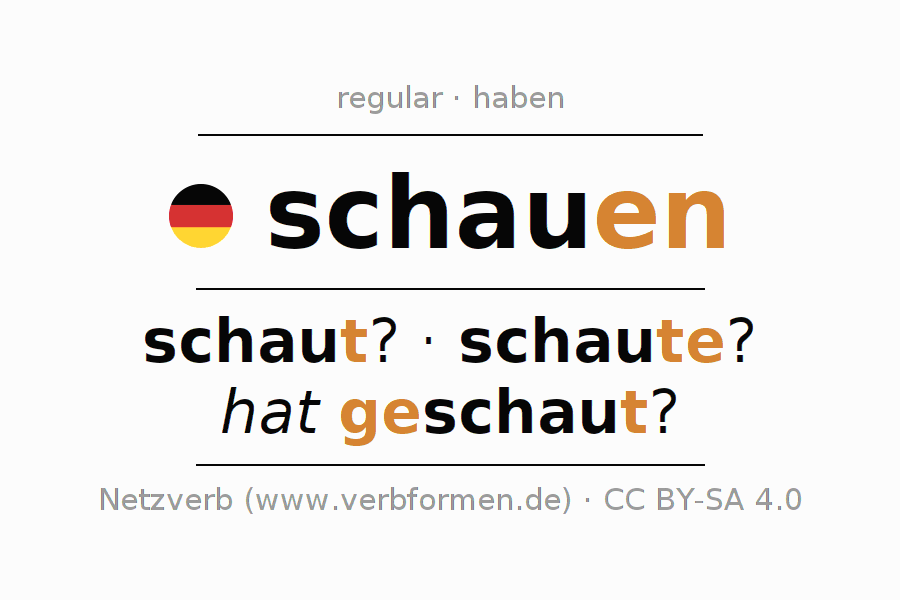 The conjugation of schauen in Imperative Present Imperative Active is schaue (du), schauen wir, schaut (ihr), schauen Sie.The conjugation corresponds to certain grammatical rules. Likewise the requirements for the conjugation of the simple verb forms of schauen in Imperative. Comments ☆