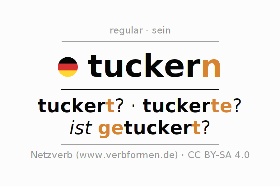 The conjugation of tuckern in Imperative Present Imperative Active is tuck(e)re (du), tuckern wir, tuckert (ihr), tuckern Sie.The conjugation corresponds to certain grammatical rules. Likewise the requirements for the conjugation of the simple verb forms of tuckern in Imperative. Comments ☆