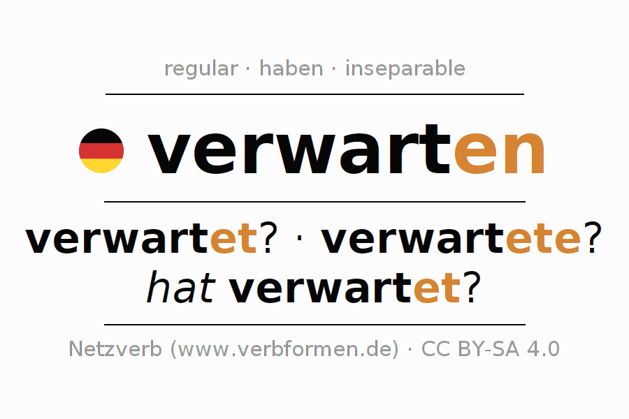 The conjugation of verwarten in Imperative Present Imperative Active is verwarte (du), verwarten wir, verwartet (ihr), verwarten Sie.The conjugation corresponds to certain grammatical rules. Likewise the requirements for the conjugation of the simple verb forms of verwarten in Imperative. Comments ☆
