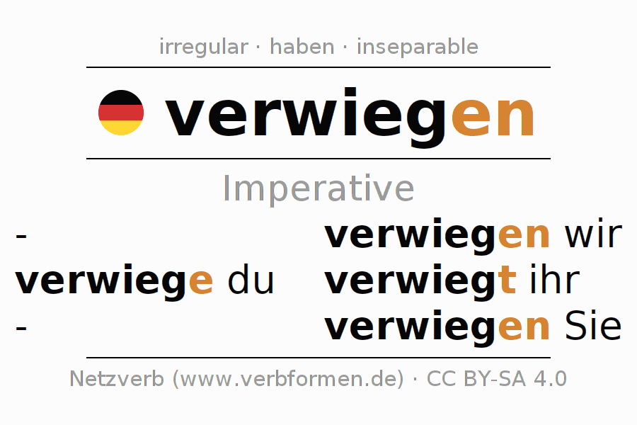 The conjugation of verwiegen in Imperative Present Imperative Active is verwiege (du), verwiegen wir, verwiegt (ihr), verwiegen Sie.The conjugation corresponds to certain grammatical rules. Likewise the requirements for the conjugation of the simple verb forms of verwiegen in Imperative. Comments ☆