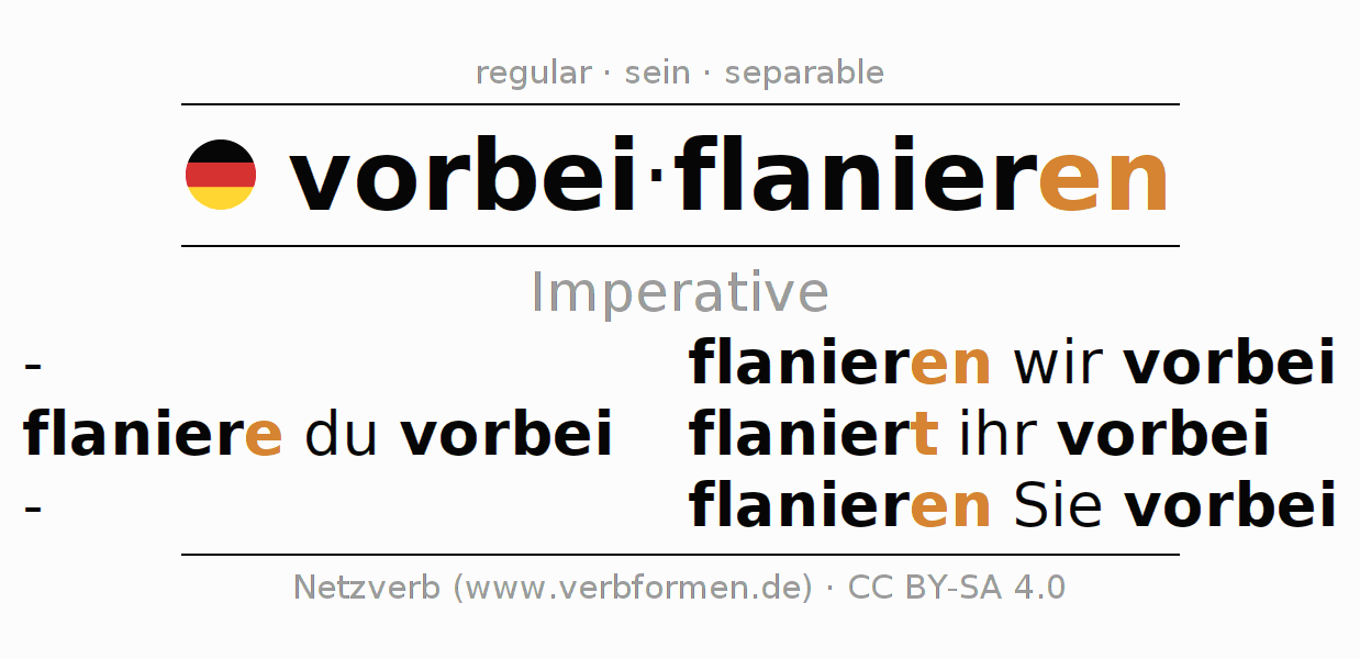 The verb vorbeiflanieren fully conjugated in all persons and numbers in the Imperative Present