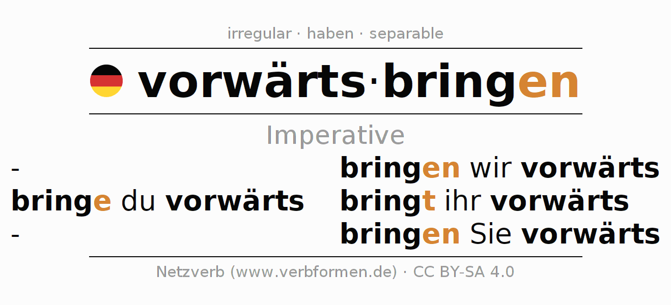 The verb vorwärtsbringen fully conjugated in all persons and numbers in the Imperative Present