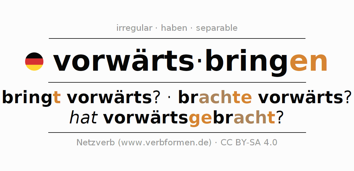 The conjugation of vorwärtsbringen in Imperative Present Imperative Active is bringe (du) vorwärts, bringen wir vorwärts, bringt (ihr) vorwärts, bringen Sie vorwärts.The conjugation corresponds to certain grammatical rules. Likewise the requirements for the conjugation of the simple verb forms of vorwärtsbringen in Imperative. Comments ☆