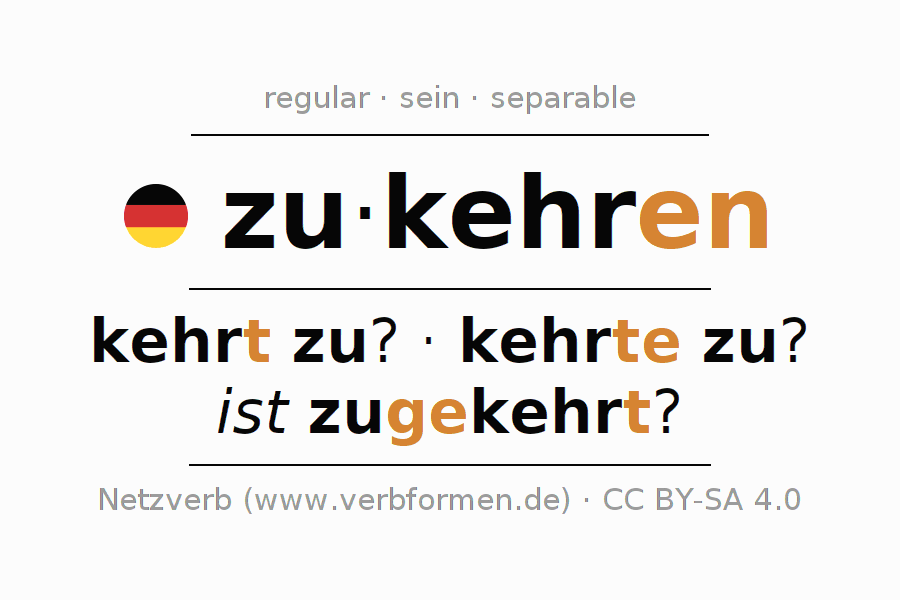 The conjugation of zukehren in Imperative Present Imperative Active is kehre (du) zu, kehren wir zu, kehrt (ihr) zu, kehren Sie zu.The conjugation corresponds to certain grammatical rules. Likewise the requirements for the conjugation of the simple verb forms of zukehren in Imperative. Comments ☆
