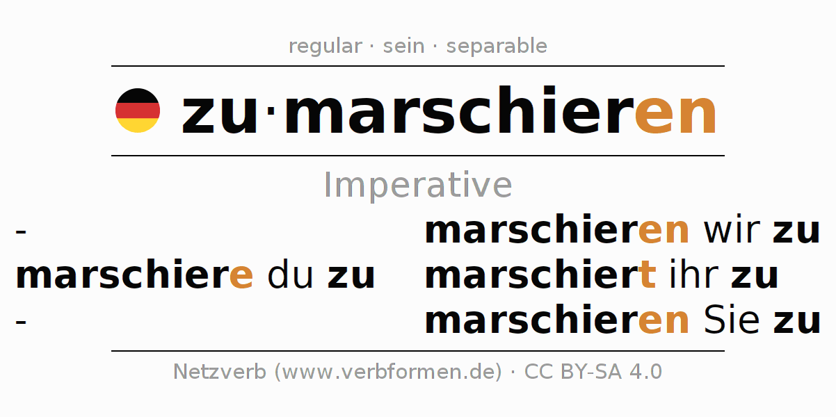 The verb zumarschieren fully conjugated in all persons and numbers in the Imperative Present