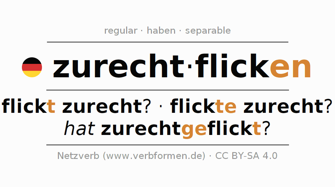 The conjugation of zurechtflicken in Imperative Present Imperative Active is flicke (du) zurecht, flicken wir zurecht, flickt (ihr) zurecht, flicken Sie zurecht.The conjugation corresponds to certain grammatical rules. Likewise the requirements for the conjugation of the simple verb forms of zurechtflicken in Imperative. Comments ☆