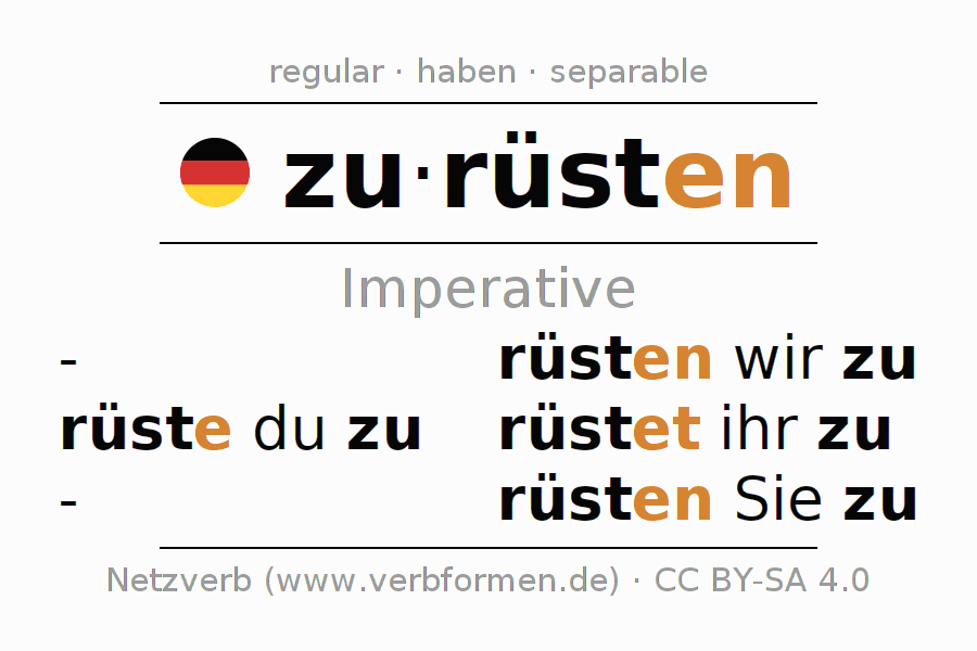 The verb zurüsten fully conjugated in all persons and numbers in the Imperative Present