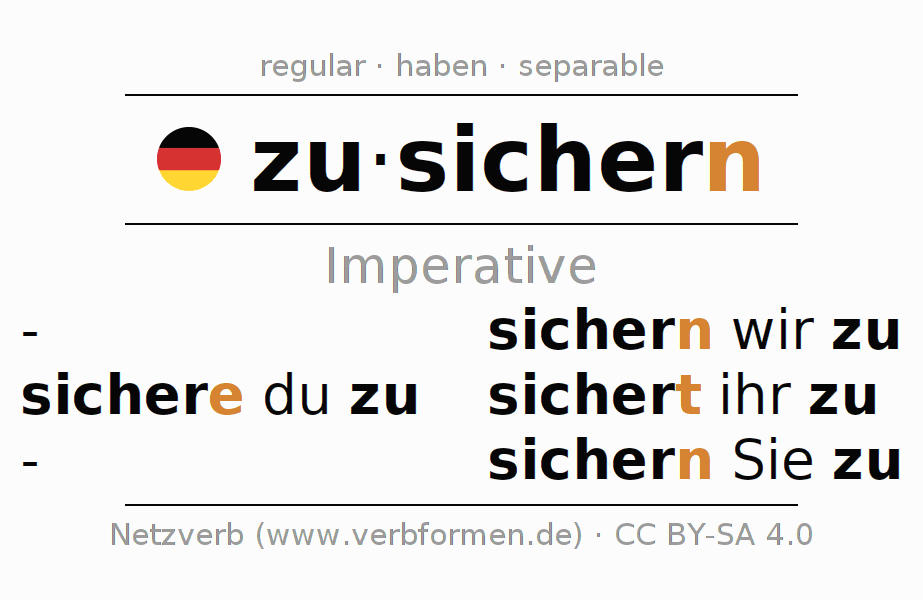 The conjugation of zusichern in Imperative Present Imperative Active is sich(e)re (du) zu, sichern wir zu, sichert (ihr) zu, sichern Sie zu.The conjugation corresponds to certain grammatical rules. Likewise the requirements for the conjugation of the simple verb forms of zusichern in Imperative. Comments ☆
