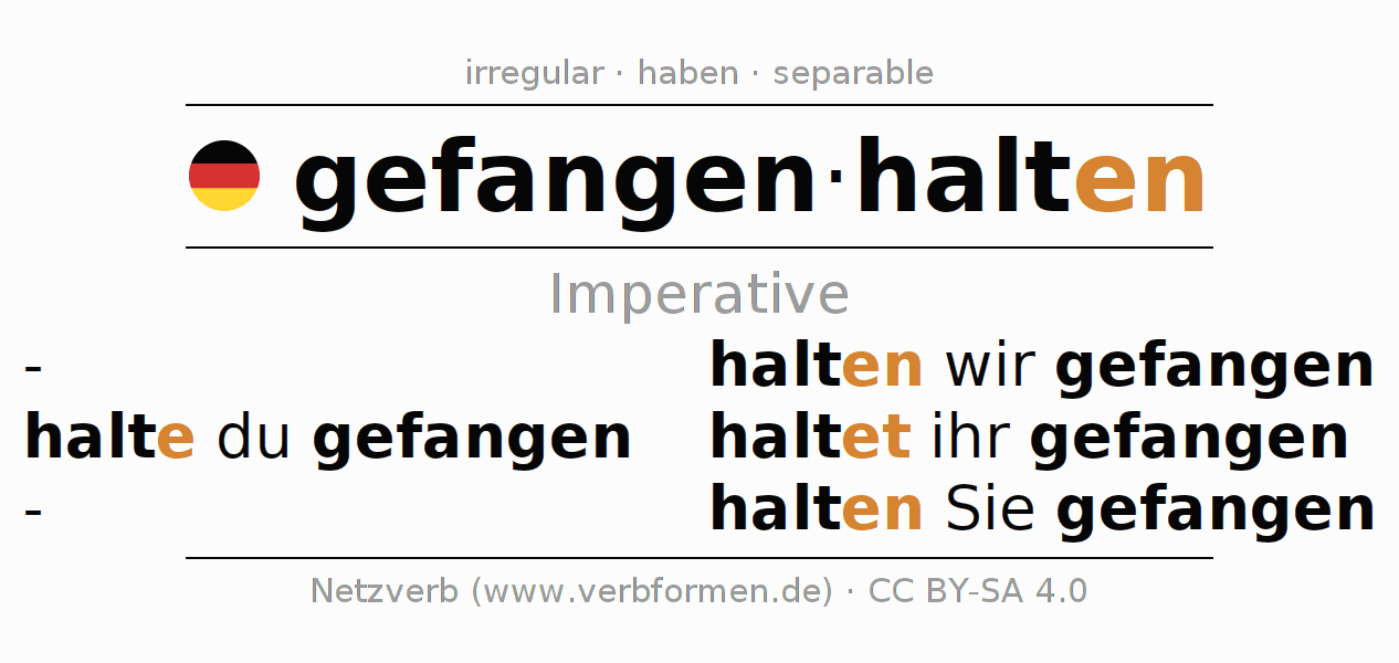 The conjugation of gefangenhalten (detain, hold captive) in the imperative is: halte (du) gefangen, halten wir gefangen, haltet (ihr) gefangen, halten Sie gefangen. The imperative is formed with the stem of present tense halt. The endings -e, -en, -et, -en are appended to the stem. The ending of the 2nd Person Singular is extended by an e, as the stem ends in t. The prefix gefangen- of gefangenhalten is separated.The personal pronoun is usually omitted in the 2nd person singular.The formation of the forms corresponds to the grammatical rules for the conjugation of the verbs in imperative. Comments ☆