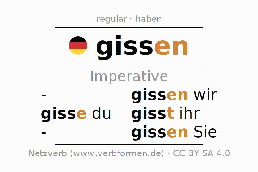 The conjugation of gissen (dead reckon, estimate) in the imperative is: gisse (du), gissen wir, gisst (ihr), gissen Sie. The imperative is formed with the stem of present tense giss. The endings -e, -en, -t, -en are appended to the stem. The personal pronoun is usually omitted in the 2nd person singular.The formation of the forms corresponds to the grammatical rules for the conjugation of the verbs in imperative. Comments ☆
