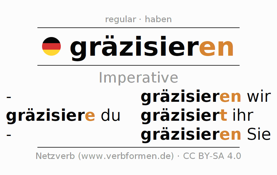 The conjugation of gräzisieren (Graecise, Grecise) in the imperative is: gräzisiere (du), gräzisieren wir, gräzisiert (ihr), gräzisieren Sie. The imperative is formed with the stem of present tense gräzisier. The endings -e, -en, -t, -en are appended to the stem. The personal pronoun is usually omitted in the 2nd person singular.The formation of the forms corresponds to the grammatical rules for the conjugation of the verbs in imperative. Comments ☆