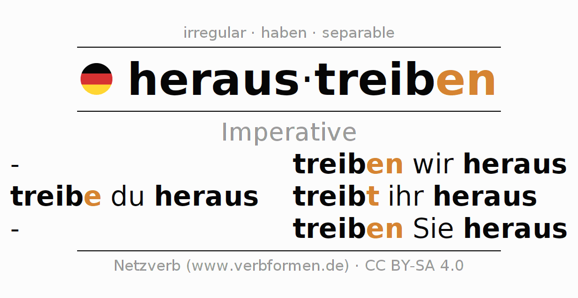 The conjugation of heraustreiben (drive out, expel) in the imperative is: treibe (du) heraus, treiben wir heraus, treibt (ihr) heraus, treiben Sie heraus. The imperative is formed with the stem of present tense treib. The endings -e, -en, -t, -en are appended to the stem. The prefix heraus- of heraustreiben is separated.The personal pronoun is usually omitted in the 2nd person singular.The formation of the forms corresponds to the grammatical rules for the conjugation of the verbs in imperative. Comments ☆