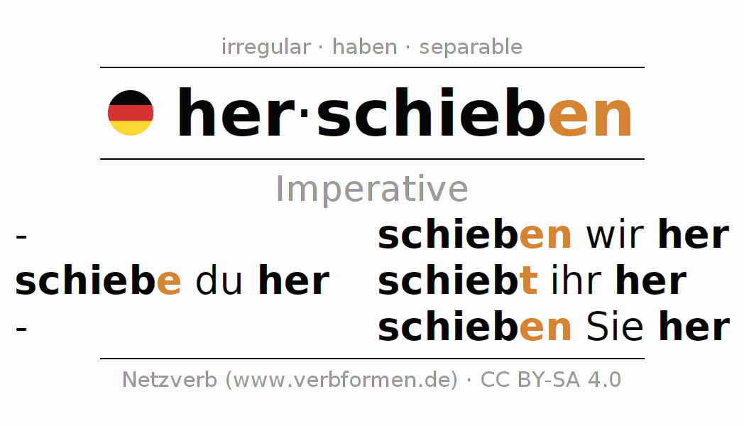 The conjugation of herschieben (push along, push closer) in the imperative is: schiebe (du) her, schieben wir her, schiebt (ihr) her, schieben Sie her. The imperative is formed with the stem of present tense schieb. The endings -e, -en, -t, -en are appended to the stem. The prefix her- of herschieben is separated.The personal pronoun is usually omitted in the 2nd person singular.The formation of the forms corresponds to the grammatical rules for the conjugation of the verbs in imperative. Comments ☆