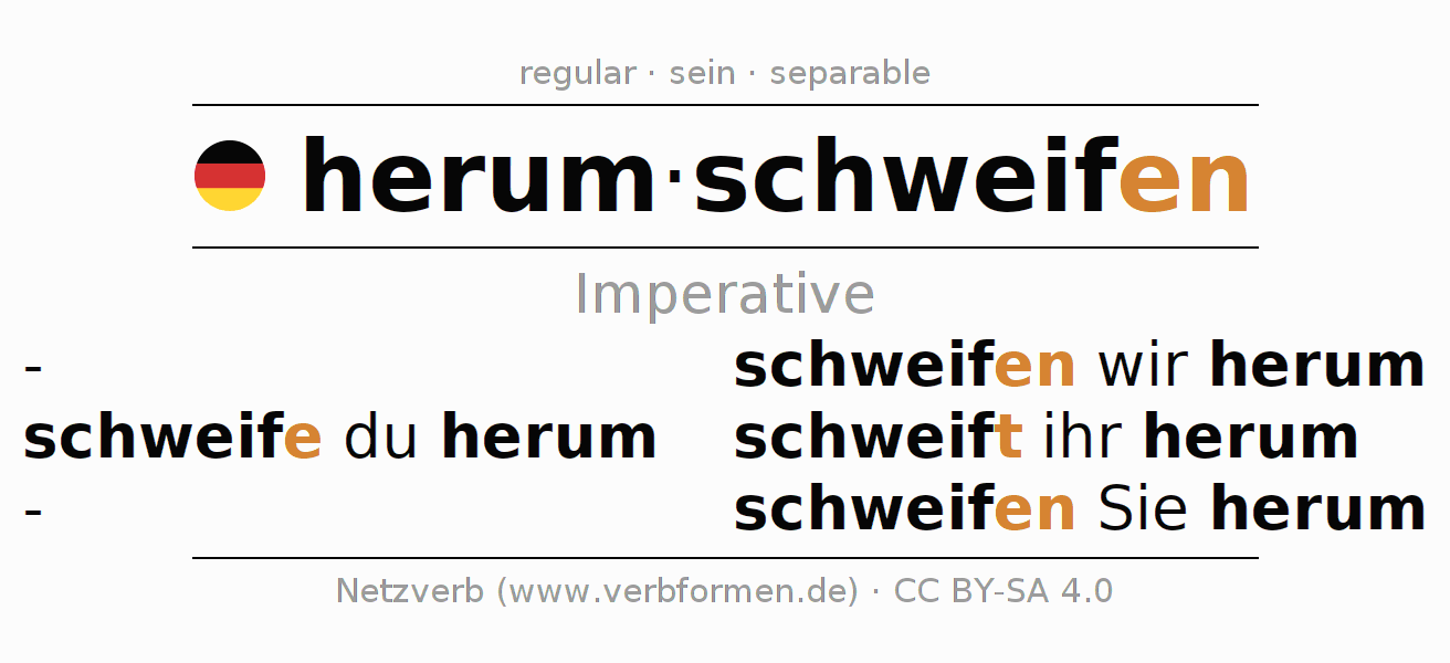 The conjugation of herumschweifen (roam, drift) in the imperative is: schweife (du) herum, schweifen wir herum, schweift (ihr) herum, schweifen Sie herum. The imperative is formed with the stem of present tense schweif. The endings -e, -en, -t, -en are appended to the stem. The prefix herum- of herumschweifen is separated.The personal pronoun is usually omitted in the 2nd person singular.The formation of the forms corresponds to the grammatical rules for the conjugation of the verbs in imperative. Comments ☆