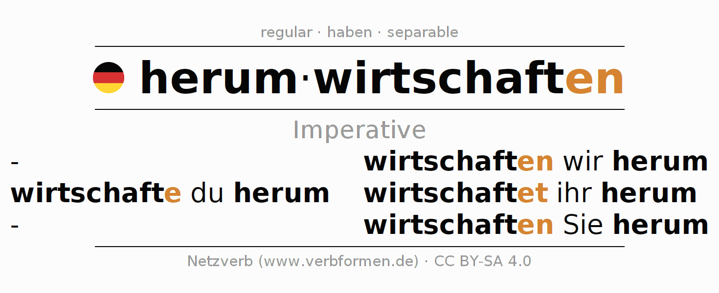 The conjugation of herumwirtschaften (putter about, potter about) in the imperative is: wirtschafte (du) herum, wirtschaften wir herum, wirtschaftet (ihr) herum, wirtschaften Sie herum. The imperative is formed with the stem of present tense wirtschaft. The endings -e, -en, -et, -en are appended to the stem. The ending of the 2nd Person Singular is extended by an e, as the stem ends in t. The prefix herum- of herumwirtschaften is separated.The personal pronoun is usually omitted in the 2nd person singular.The formation of the forms corresponds to the grammatical rules for the conjugation of the verbs in imperative. Comments ☆