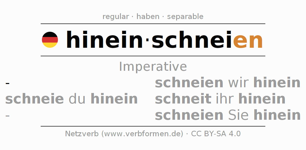 The conjugation of hineinschneien (snow in, snow inside) in the imperative is: schneie (du) hinein, schneien wir hinein, schneit (ihr) hinein, schneien Sie hinein. The imperative is formed with the stem of present tense schnei. The endings -e, -en, -t, -en are appended to the stem. The prefix hinein- of hineinschneien is separated.The personal pronoun is usually omitted in the 2nd person singular.The formation of the forms corresponds to the grammatical rules for the conjugation of the verbs in imperative. Comments ☆