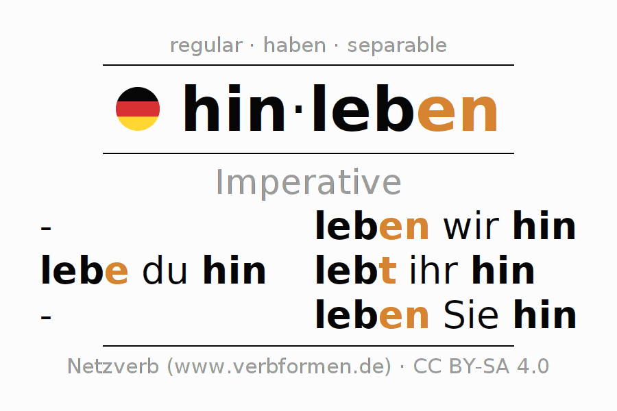 The conjugation of hinleben (drift, live aimlessly) in the imperative is: lebe (du) hin, leben wir hin, lebt (ihr) hin, leben Sie hin. The imperative is formed with the stem of present tense leb. The endings -e, -en, -t, -en are appended to the stem. The prefix hin- of hinleben is separated.The personal pronoun is usually omitted in the 2nd person singular.The formation of the forms corresponds to the grammatical rules for the conjugation of the verbs in imperative. Comments ☆