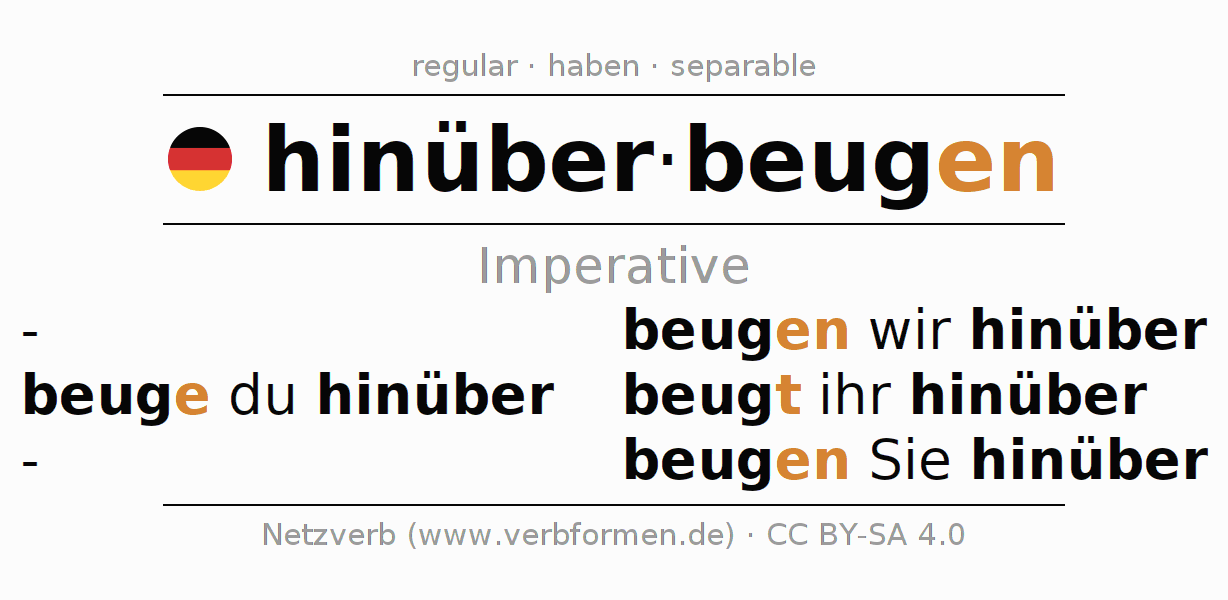 The conjugation of hinüberbeugen (lean over) in the imperative is: beuge (du) hinüber, beugen wir hinüber, beugt (ihr) hinüber, beugen Sie hinüber. The imperative is formed with the stem of present tense beug. The endings -e, -en, -t, -en are appended to the stem. The prefix hinüber- of hinüberbeugen is separated.The personal pronoun is usually omitted in the 2nd person singular.The formation of the forms corresponds to the grammatical rules for the conjugation of the verbs in imperative. Comments ☆