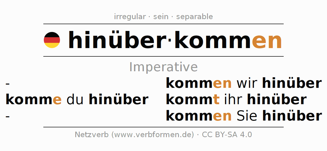 The conjugation of hinüberkommen (come over, visit) in the imperative is: komme (du) hinüber, kommen wir hinüber, kommt (ihr) hinüber, kommen Sie hinüber. The imperative is formed with the stem of present tense komm. The endings -e, -en, -t, -en are appended to the stem. The prefix hinüber- of hinüberkommen is separated.The personal pronoun is usually omitted in the 2nd person singular.The formation of the forms corresponds to the grammatical rules for the conjugation of the verbs in imperative. Comments ☆