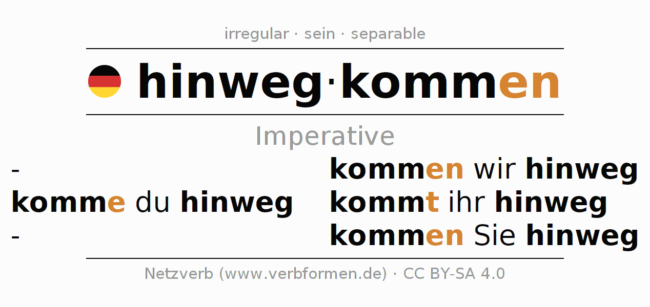 The conjugation of hinwegkommen (get (over), get over) in the imperative is: komme (du) hinweg, kommen wir hinweg, kommt (ihr) hinweg, kommen Sie hinweg. The imperative is formed with the stem of present tense komm. The endings -e, -en, -t, -en are appended to the stem. The prefix hinweg- of hinwegkommen is separated.The personal pronoun is usually omitted in the 2nd person singular.The formation of the forms corresponds to the grammatical rules for the conjugation of the verbs in imperative. Comments ☆
