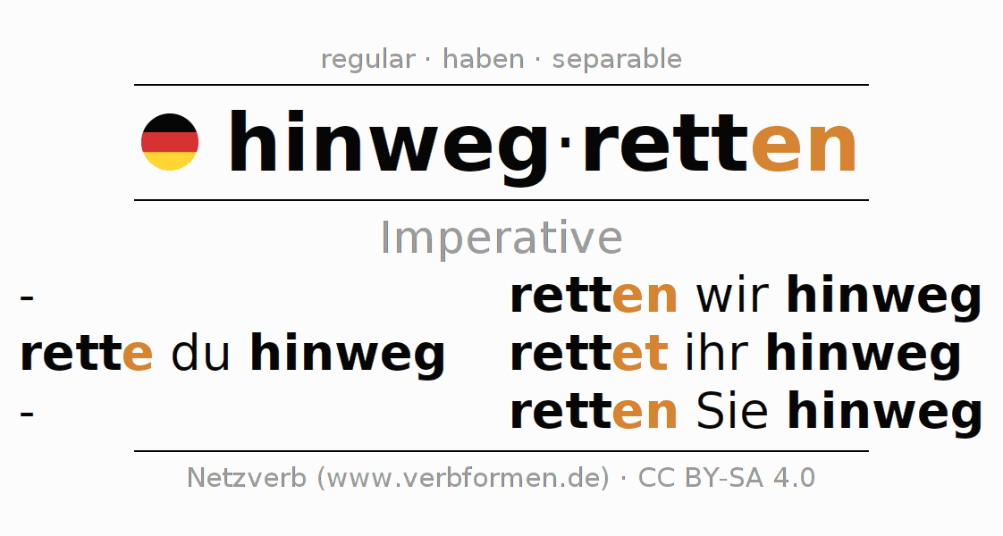 The conjugation of hinwegretten (preserve (from), rescue) in the imperative is: rette (du) hinweg, retten wir hinweg, rettet (ihr) hinweg, retten Sie hinweg. The imperative is formed with the stem of present tense rett. The endings -e, -en, -et, -en are appended to the stem. The ending of the 2nd Person Singular is extended by an e, as the stem ends in t. The prefix hinweg- of hinwegretten is separated.The personal pronoun is usually omitted in the 2nd person singular.The formation of the forms corresponds to the grammatical rules for the conjugation of the verbs in imperative. Comments ☆