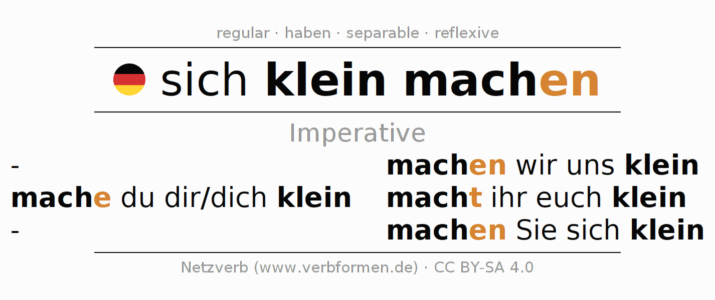 The conjugation of sich kleinmachen (belittle oneself, change) in the imperative is: mache (du) dir/dich klein, machen wir uns klein, macht (ihr) euch klein, machen Sie sich klein. The imperative is formed with the stem of present tense mach. The endings -e, -en, -t, -en are appended to the stem. The prefix klein - of sich kleinmachen is separated.The personal pronoun is usually omitted in the 2nd person singular.The formation of the forms corresponds to the grammatical rules for the conjugation of the verbs in imperative. Comments ☆