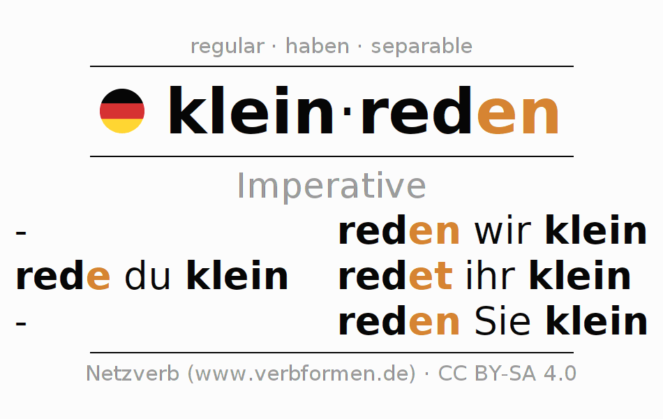 The conjugation of kleinreden (downplay, play down) in the imperative is: rede (du) klein, reden wir klein, redet (ihr) klein, reden Sie klein. The imperative is formed with the stem of present tense red. The endings -e, -en, -et, -en are appended to the stem. The ending of the 2nd Person Singular is extended by an e, as the stem ends in d. The prefix klein- of kleinreden is separated.The personal pronoun is usually omitted in the 2nd person singular.The formation of the forms corresponds to the grammatical rules for the conjugation of the verbs in imperative. Comments ☆