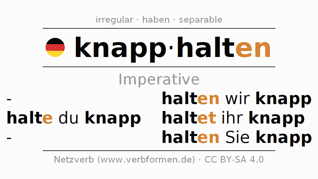 The conjugation of knapphalten (keep short of, skimp) in the imperative is: halte (du) knapp, halten wir knapp, haltet (ihr) knapp, halten Sie knapp. The imperative is formed with the stem of present tense halt. The endings -e, -en, -et, -en are appended to the stem. The ending of the 2nd Person Singular is extended by an e, as the stem ends in t. The prefix knapp- of knapphalten is separated.The personal pronoun is usually omitted in the 2nd person singular.The formation of the forms corresponds to the grammatical rules for the conjugation of the verbs in imperative. Comments ☆