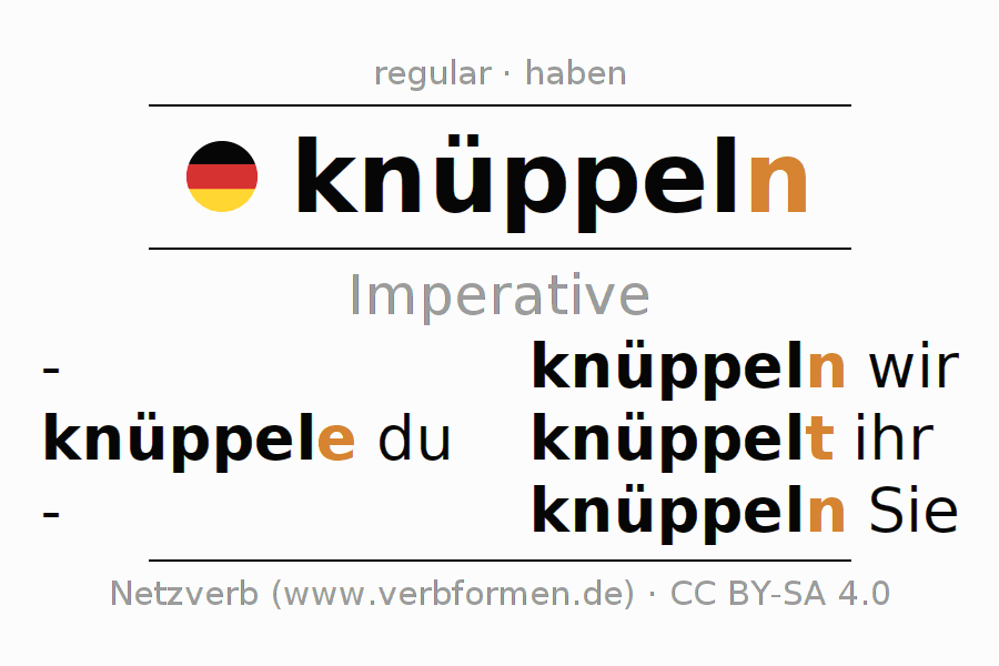 The conjugation of knüppeln (bludgeon, club) in the imperative is: knüpp(e)le (du), knüppeln wir, knüppelt (ihr), knüppeln Sie. The imperative is formed with the stem of present tense knüppel. The endings -e, -n, -t, -n are appended to the stem. The endings in the 1st and 3rd person plural are shortened by e, since the verb ends with -ern. The personal pronoun is usually omitted in the 2nd person singular.The formation of the forms corresponds to the grammatical rules for the conjugation of the verbs in imperative. Comments ☆