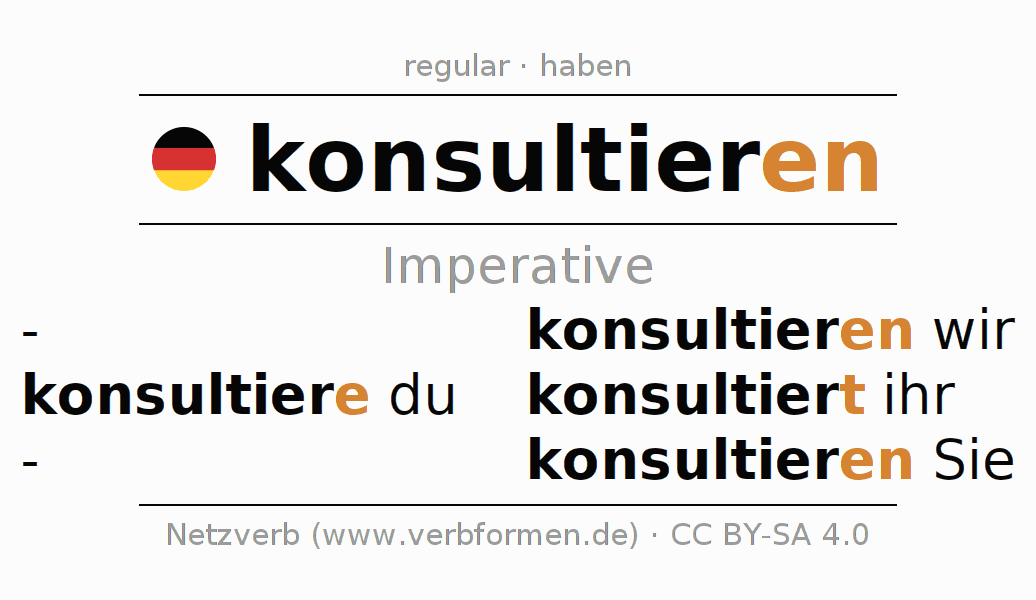 The conjugation of konsultieren (consult, advise) in the imperative is: konsultiere (du), konsultieren wir, konsultiert (ihr), konsultieren Sie. The imperative is formed with the stem of present tense konsultier. The endings -e, -en, -t, -en are appended to the stem. The personal pronoun is usually omitted in the 2nd person singular.The formation of the forms corresponds to the grammatical rules for the conjugation of the verbs in imperative. Comments ☆