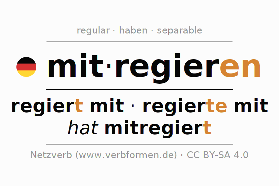 The conjugation of mitregieren (co-govern, co-rule) in the imperative is: regiere (du) mit, regieren wir mit, regiert (ihr) mit, regieren Sie mit. The imperative is formed with the stem of present tense regier. The endings -e, -en, -t, -en are appended to the stem. The prefix mit- of mitregieren is separated.The personal pronoun is usually omitted in the 2nd person singular.The formation of the forms corresponds to the grammatical rules for the conjugation of the verbs in imperative. Comments ☆