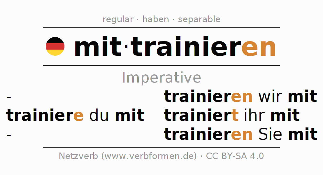The conjugation of mittrainieren (train together, train with others) in the imperative is: trainiere (du) mit, trainieren wir mit, trainiert (ihr) mit, trainieren Sie mit. The imperative is formed with the stem of present tense trainier. The endings -e, -en, -t, -en are appended to the stem. The prefix mit- of mittrainieren is separated.The personal pronoun is usually omitted in the 2nd person singular.The formation of the forms corresponds to the grammatical rules for the conjugation of the verbs in imperative. Comments ☆