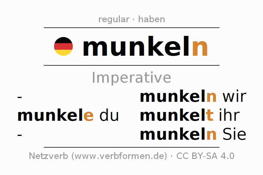 The conjugation of munkeln (gossip, rumor) in the imperative is: munk(e)le (du), munkeln wir, munkelt (ihr), munkeln Sie. The imperative is formed with the stem of present tense munkel. The endings -e, -n, -t, -n are appended to the stem. The endings in the 1st and 3rd person plural are shortened by e, since the verb ends with -ern. The personal pronoun is usually omitted in the 2nd person singular.The formation of the forms corresponds to the grammatical rules for the conjugation of the verbs in imperative. Comments ☆