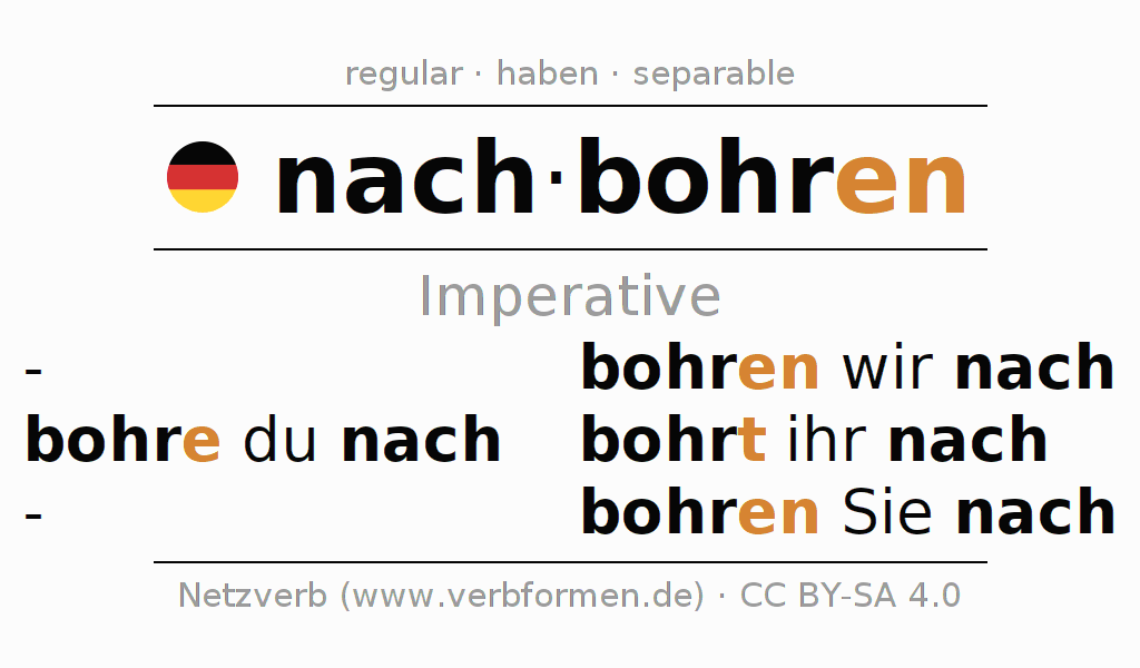 The conjugation of nachbohren (probe, follow-up) in the imperative is: bohre (du) nach, bohren wir nach, bohrt (ihr) nach, bohren Sie nach. The imperative is formed with the stem of present tense bohr. The endings -e, -en, -t, -en are appended to the stem. The prefix nach- of nachbohren is separated.The personal pronoun is usually omitted in the 2nd person singular.The formation of the forms corresponds to the grammatical rules for the conjugation of the verbs in imperative. Comments ☆