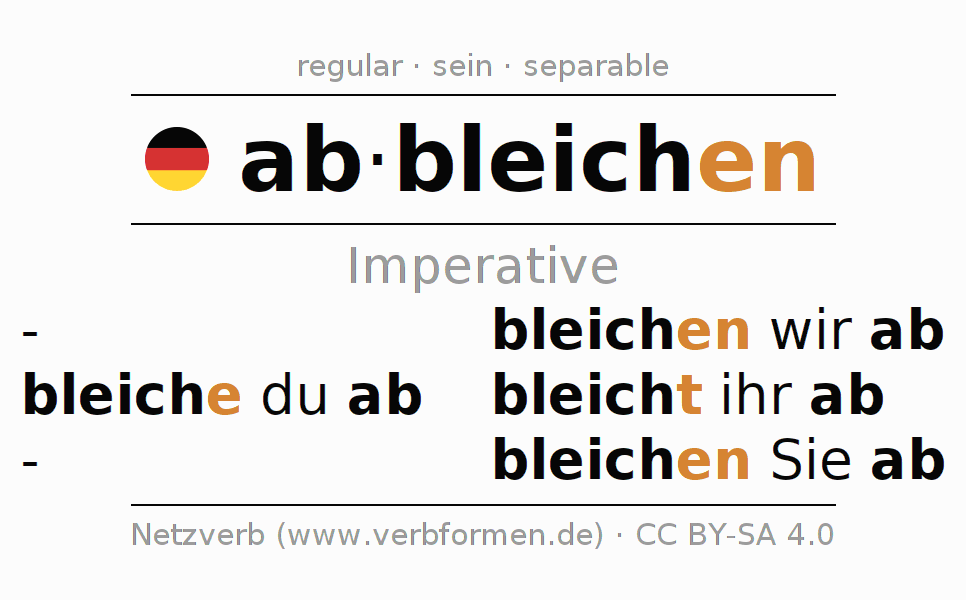 The conjugation of abbleichen in Imperative Present Imperative Active is bleiche (du) ab, bleichen wir ab, bleicht (ihr) ab, bleichen Sie ab.The conjugation corresponds to certain grammatical rules. Likewise the requirements for the conjugation of the simple verb forms of abbleichen in Imperative. Comments ☆