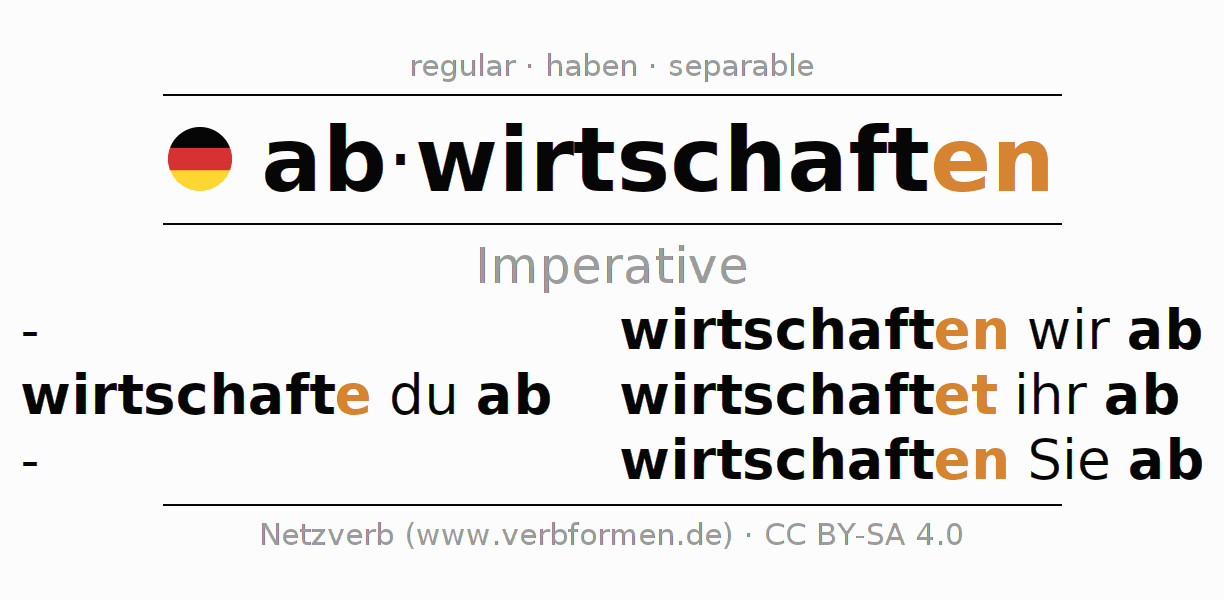 The conjugation of abwirtschaften in Imperative Present Imperative Active is wirtschafte (du) ab, wirtschaften wir ab, wirtschaftet (ihr) ab, wirtschaften Sie ab.The conjugation corresponds to certain grammatical rules. Likewise the requirements for the conjugation of the simple verb forms of abwirtschaften in Imperative. Comments ☆