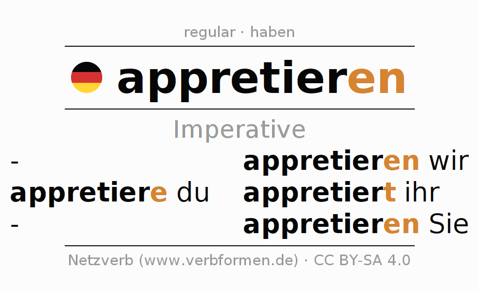 The conjugation of appretieren in Imperative Present Imperative Active is appretiere (du), appretieren wir, appretiert (ihr), appretieren Sie.The conjugation corresponds to certain grammatical rules. Likewise the requirements for the conjugation of the simple verb forms of appretieren in Imperative. Comments ☆
