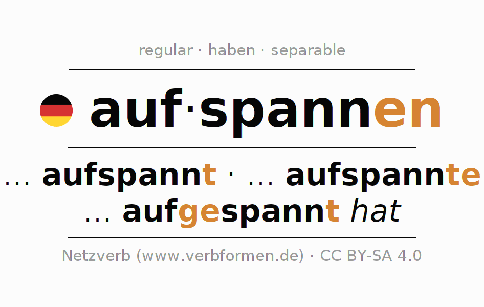 The conjugation of aufspannen in Imperative Present Imperative Active is spanne (du) auf, spannen wir auf, spannt (ihr) auf, spannen Sie auf.The conjugation corresponds to certain grammatical rules. Likewise the requirements for the conjugation of the simple verb forms of aufspannen in Imperative. Comments ☆