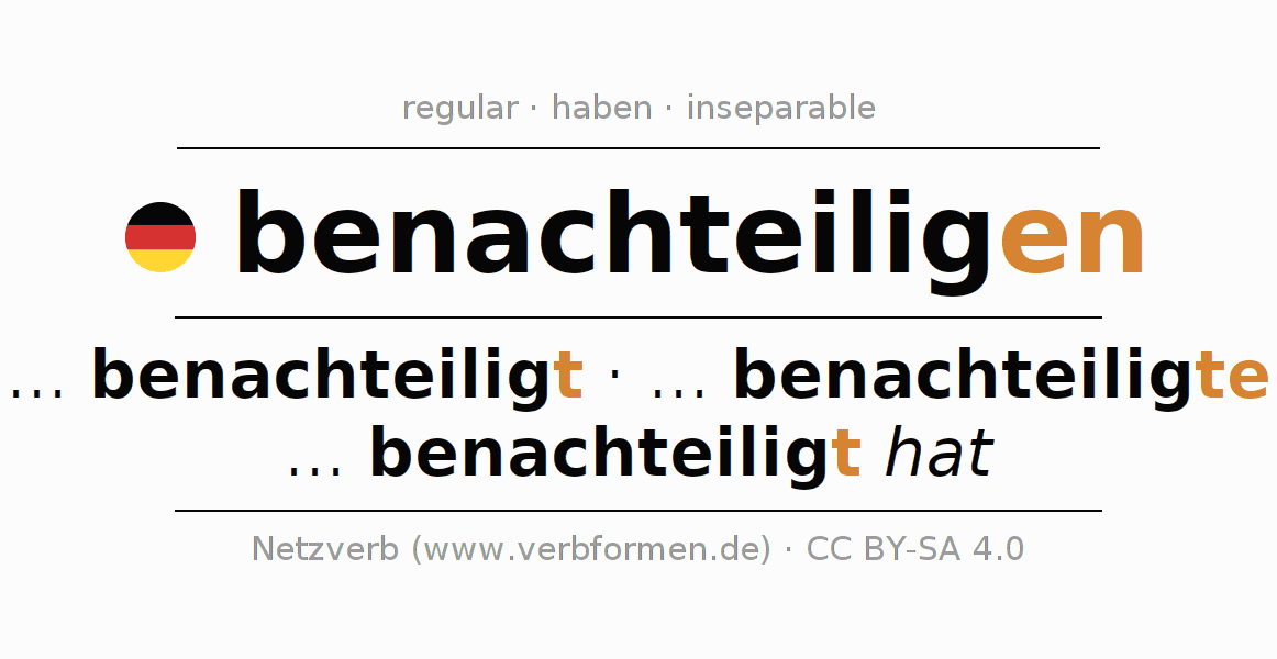 The conjugation of benachteiligen in Imperative Present Imperative Active is benachteilige (du), benachteiligen wir, benachteiligt (ihr), benachteiligen Sie.The conjugation corresponds to certain grammatical rules. Likewise the requirements for the conjugation of the simple verb forms of benachteiligen in Imperative. Comments ☆