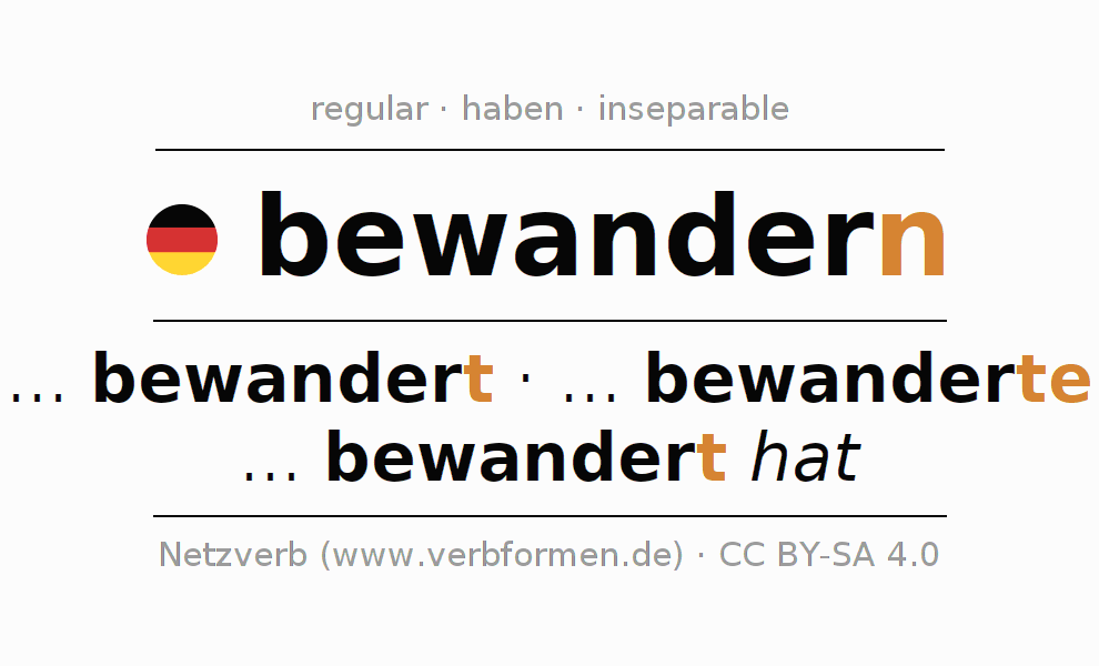 The conjugation of bewandern in Imperative Present Imperative Active is bewand(e)re (du), bewandern wir, bewandert (ihr), bewandern Sie.The conjugation corresponds to certain grammatical rules. Likewise the requirements for the conjugation of the simple verb forms of bewandern in Imperative. Comments ☆
